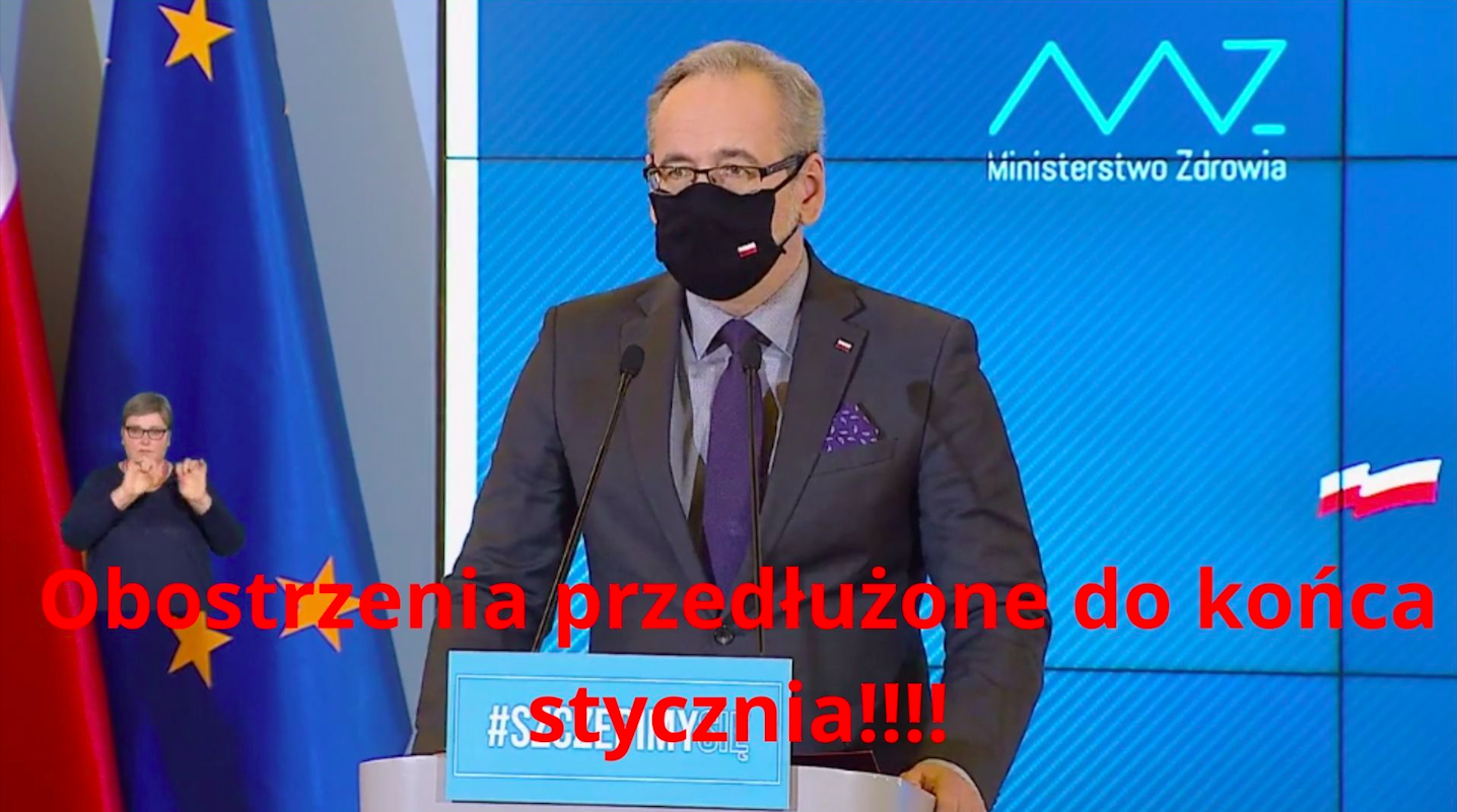 Powiat Kłodzki. Minister zdrowia Adam Niedzielski przekazał podczas dzisiejszej konferencji prasowe, że obowiązujące obecnie obostrzenia będą przedłużone do końca stycznia. Jedynym wyjątkiem będzie powrót dzieci z klas I-III szkoły podstawowej od 18 stycznia do stacjonarnej nauki w szkołach. Przypomnijmy. Od 28 grudnia 2020 roku zamknięte są hotele, stoki narciarskie, galerie handlowe (z wyjątkiem sklepów spożywczych, sklepów z książkami i prasą, drogerii, aptek). Po powrocie do Polski transportem zbiorowym, obowiązuje 10-dniowa kwarantanna. Zamknięte pozostają również baseny, kluby fitness, siłwonie, restauracje, kina, muzea, teatry, a także galerie sztuki. Zgromadzenia publiczne są ograniczone do pięciu osób. Limity obowiązują też w sklepach i kościołach.Minister zdrowia na konferencji prasowej zwrócił także uwagę na zagrożenie trzecią falą koronawirusa. Podkreślił, że w Europie jest sporo implusów, które o tym świadczą. Polityk podkreślił również, że sytuacja w Polsce wygląda na tą chwilę stabilnie.
