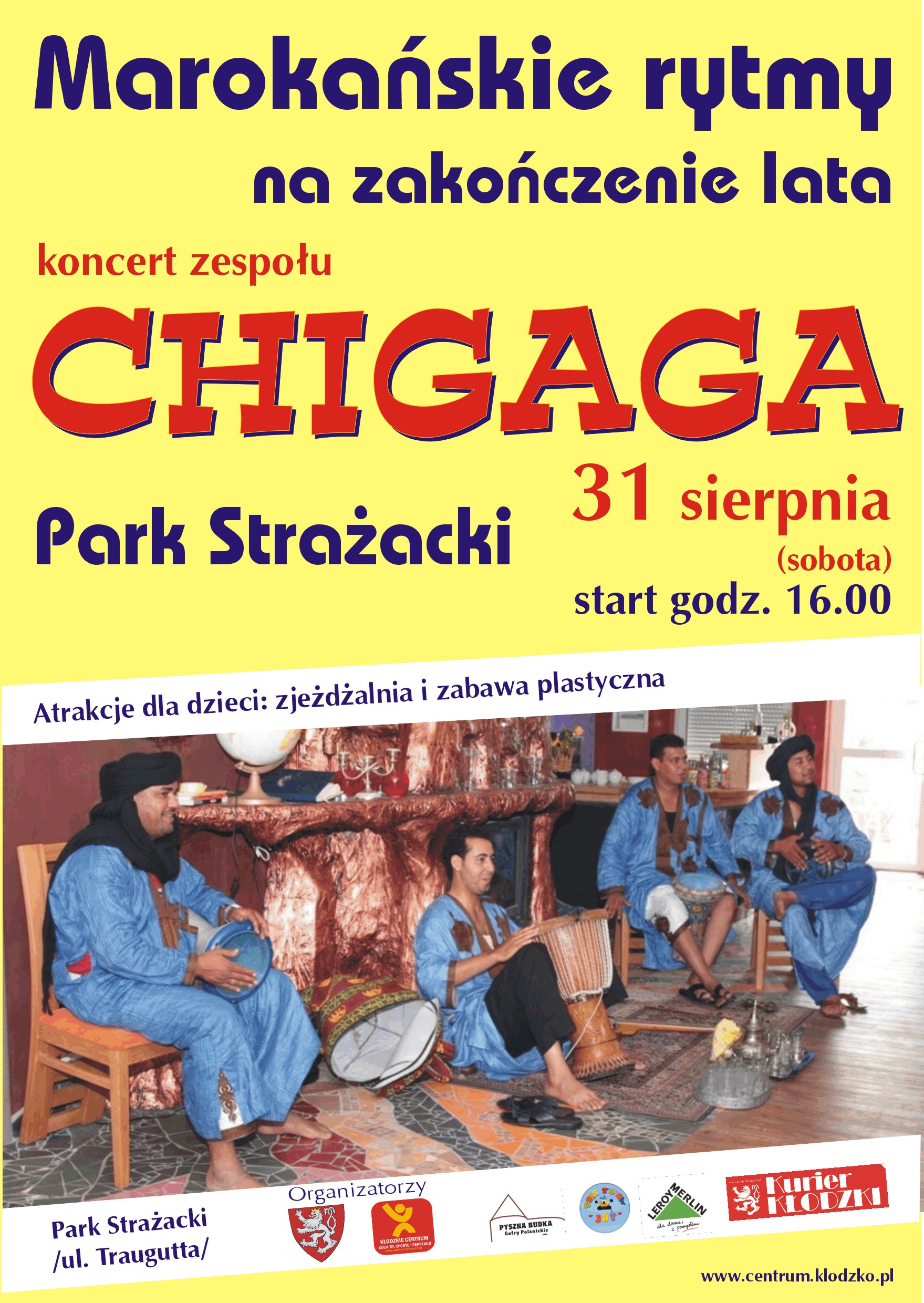 31 sierpnia o godz. 16.00 w Parku Strażackiego przy ul. Traugutta wystąpi afrykańska grupa Chigaga. Zespół pochodzi z południowego Maroka, z miejscowości M’Hammid – położonej tuż przy piaskach Sahary. Nazwa grupy muzycznej wywodzi się od wysokich wydm o nazwie Chigaga Erg (Erg – wydma). Sześciu muzyków, reprezentantów ludu Nomadów, porywie swoją muzyką do tańca, klaskania, zabawy. Ubrani w tradycyjne niebieskie stroje z turbanami na głowach z pewnością stanowić będą niespotykany widok w mieście nad Nysą Kłodzką. Swoją muzykę wydobywać będą z takich instrumentów jak: banjo, bębny, darbuka, kastaniety.