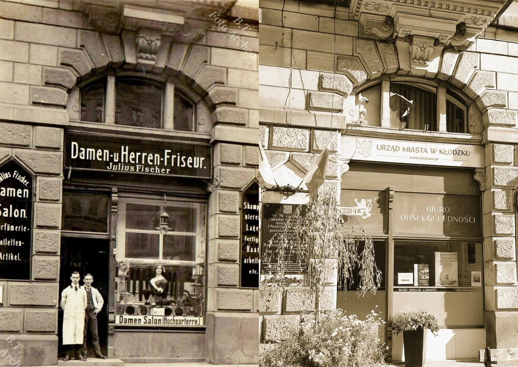 Michał Piszko opublikował zdjęcia kłodzkiego Ratusza. Fotografie dzieli 110 lat. Czy wiedzieliście, że w miejscu dzisiejszego Biura Obsługi Ludności był kiedyś fryzjer?