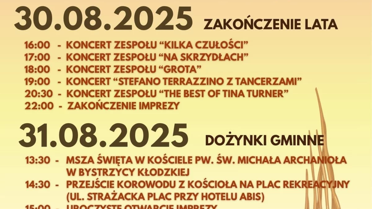 Na placu rekreacyjnym przy ul. Strażackiej, obok hotelu Abis, odbędą się Dożynki Gminne połączone z dwudniowym festynem pełnym koncertów, występów artystycznych i rodzinnych atrakcji.