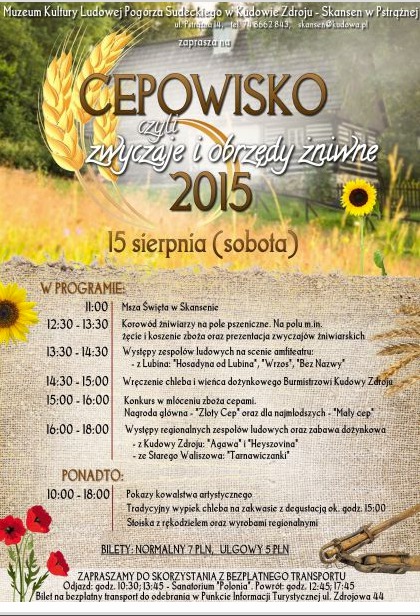 W PROGRAMIE: 11.00 – MSZA ŚW. W SKANSENIE 12.30-13.30 – KOROWÓD ŻNIWIARZY NA POLE PSZENICZNE. NA POLU M.IN. ŻĘCIE I KOSZENIE ZBOŻA ORAZ PREZENTACJA ZWYCZAJÓW ŻNIWIARSKICH 13.30-14.30 – WYSTEPY ZESPOŁÓW LUDOWYCH NA SCENIE AMFITEATRU: Z LUBINA:”HOSADYNA OD LUBINA”, „WRZOS”, „BEZ NAZWY” 14.30-15.00 – WRĘCZENIE CHLEBA I WIEŃCA DOŻYNKOWEGO BURMISTRZOWI MIASTA 15.00-16.00 – KONKURS W MŁÓCENIU ZBOŻA CEPAMI NAGRODA GŁÓWNA „ZŁOTY CEP” A DLA NAJMŁODSZYCH „MAŁY CEP” 16.00-18.00 – WYSTĘPY REGIONALNYCH ZESPOŁÓW LUDOWYCH I ZABAWA DOŻYNKOWA Z KUDOWY ZDROJU: „AGAWA” I „HEYSZOVINA” ZE STAREGO WALISZOWA: „TARNAWICZANKI” PONADTO: 10.00-18.00 POKAZY KOWALSTWA ARTYSTYCZNEGO TRADYCYJNY WYPIEK CHLEBA NA ZAKWASIE Z DEGUSTACJĄ OK. GODZ.15.00 STOISKA Z RĘKODZIEŁEM I WYROBAMI REGIONALNYMI WSTĘP: 7 ZŁ. BILET NORMALNY 5 ZŁ. BILET ULGOWY ZAPRASZAMY DO SKORZYSTANIA Z BEZPŁATNEGO TRANSPORTU: ODJAZD: GODZ.10.30; 13.45 SANATORIUM „POLONIA” POWRÓT: GODZ. 12.45; 17.45 BILETY NA BEZPŁATNY TRANSPORT DO ODEBRANIA W PUNKCIE INFORMACJI TURYSTYCZNEJ UL. ZDROJOWA 44