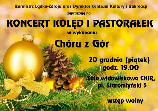 Koncert Kolęd i Pastorałek w wykonaniu "Chóru z Gór" odbędzie się 20 grudnia o godz. 19.00 w Sali widowiskowej CKiR, pl. Staromłyński 5 w Lądku - Zdroju. Wstęp wolny.