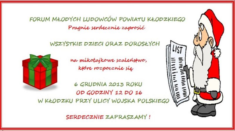 Mikołajki to czas magiczny, w którym uśmiech malujący się na zmarzniętych twarzach, przyprószony radością staje się bezcenny. To dzień, w którym każdy człowiek jest ważny niezależnie od wieku, a mikołajowe czapki są nieodłącznym elementem ubioru wysłanników świętego. Forum Młodych Ludowców (z pomocą podsekretarz stanu w Ministerstwie Skarbu Państwa pani Urszuli Pasławskiej a także pani Ewy Mańkowskiej - wicewojewody dolnośląskiej, pani Grażyny Cal - radnej Sejmiku Województwa Dolnośląskiego, pani Ilony Antoniszyn-Klik - podsekretarz stanu w Ministerstwie Gospodarki, pana Stanisława Rakoczego – podsekretarza stanu w Ministerstwie Spraw Wewnętrznych, pana Włodzimierza Chlebosza - Członka Zarządu Województwa Dolnośląskiego, Pana Jarosława Kalinowskiego - Posła do Parlamentu Europejskiego, Przewodniczącego Rady Naczelnej PSL, Pana Janusza Piechocińskiego - Wicepremiera, Ministra Gospodarki, Prezesa PSL, Pana Teodora Stępy - Wiceprezesa Wałbrzyskiej Specjalnej Strefy Ekonomicznej oraz wielkiej nieocenionej pomocy młodych ludzi i Prezesa Zarządu Powiatowego PSL w Kłodzku Ryszarda Niebieszczańskiego wraz z Zarządem), niczym gwardia Mikołaja dnia 6 grudnia w godzinach od 12 do 16 umili czas wszystkim dzieciom i dorosłym znajdującym się na ul. Wojska Polskiego w pobliżu Liceum Ogólnokształcącego im. Bolesława Chrobrego w Kłodzku. W pakiecie z entuzjazmem dostarczą upominki. Ich zapał i chęci z pewnością udzielą się wszystkim pojawiającym się w pobliżu. Będą widoczni z daleka, z każdej możliwej strony. Bo im nie straszny ani mróz, ani zawierucha.