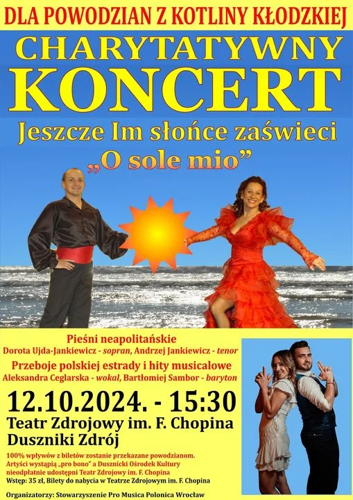 O godzinie 15:30 na deskach Teatru Zdrojowego w ramach koncertu „Jeszcze Im słońce zaświeci” wystąpią dwa znamienite duety. Na początek pieśni neapolitańskie zaprezentuje duet małżeński Dorota Ujda-Jankiewicz oraz Andrzej Jankiewicz, a zebrana publiczność będzie mogła usłyszeć m.in. „O Sole Mio” i „Santa Lucia”. Po nich usłyszymy wokal Aleksandry Ceglarskiej oraz Bartłomieja Sambora, którzy z największą pasją wykonają przeboje polskiej estrady oraz musicalowe hity (Miłość w Portofino, Gdybym był bogaczem). 100% wpływów z biletu zostanie przekazane na pomoc powodzianom.
