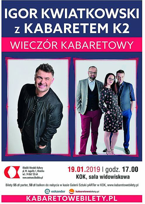 KulturaKłodzki Ośrodek Kultury zaprasza na program Kabaretu K2 z gościnnym udziałem Igora Kwiatkowskiego, który powala niepowtarzalnym urokiem i błyskotliwą ripostą.