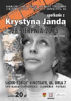 W najbliższą środę, 28 sierpnia, będzie można spotkać się ze znaną polską aktorką, Krystyną Jandą. Artystka przyjedzie do Lądka-Zdroju. O godzinie 19.00 spotka się ze swoimi fanami, których szczególnie w najstarszym polskim kurorcie, gdzie od kilku lat organizowane są festiwale poświęcone twórczości tej aktorki, nie brakuje. Spotkanie z Jandą poprowadzi Sławomir Pietras (Kinoteatr przy ul. Orlej). Cena wejściówki 20 zł.