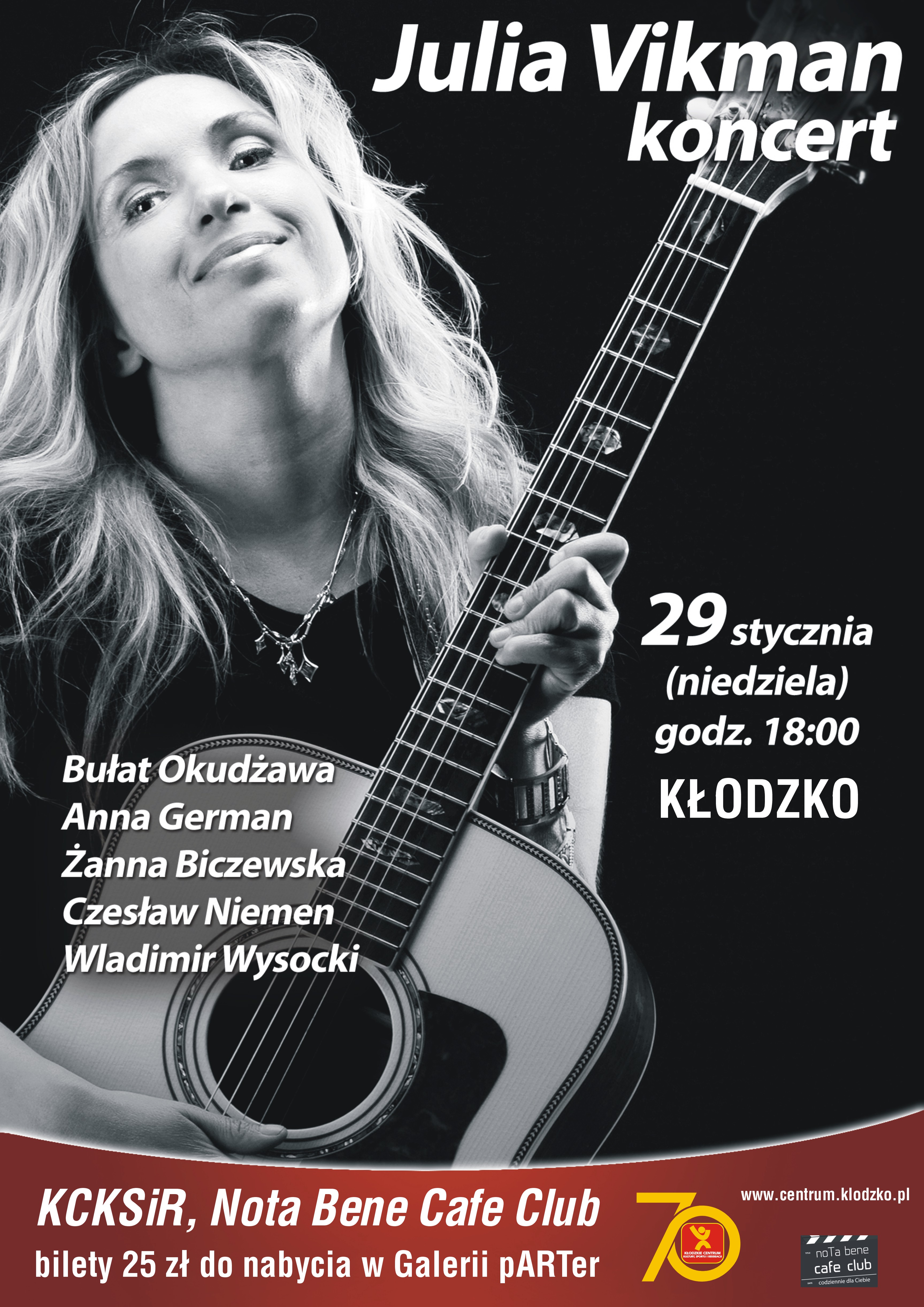 Julia Vikman, ze strony babci pochodzi z Polski, a ze strony dziadka ze Szwecji. Jeszcze przed rewolucją, za czasów carskiej Rosji, jej dziadkowie zostali zesłani na Syberię, gdzie się spotkali i założyli rodzinę. Ojciec Julii, zasłużony artysta Paweł Vikman, był dyrektorem Teatru Opery i Baletu w Kiszyniowie, znał osobiście Bułata Okudżawę. Sama Julia Vikman jest absolwentką Akademii Muzycznej w klasie fortepianu. Po przeprowadzeniu się do Polski, rozpoczęła karierę solową w Gdańsku i założyła swój zespół JVB. Koncertuje w Polsce, Niemczech i we Francji. Występuje na jednej scenie z Marylą Rodowicz, Ryszardem Rynkowskim, Budką Suflera, Moscow City Ballet i Chórem Aleksandrowa. W roku 2008 Julia Vikman wydała płytę pt. „Podmoskiewskie wieczory” ze znanymi rosyjskimi utworami z lat 60. i 70. ubiegłego wieku oraz popularnymi w Polsce balladami i romansami. W sierpniu 2014 pojawiła się pierwsza płyta z autorskim materiałem Julii Vikman „The Autumn Dreams”. Album zawiera 6 utworów, którymi Julia prezentuje swój niebywały talent kompozytorski i wokalny. Na płycie można usłyszeć elementy folku, jazzu i progresywnego rocka. Julia Vikman zaśpiewa w Kłodzku 29 stycznia o godz. 18.00 (kawiarnia Nota Bene Cafe). Bilety kosztują 25 zł.