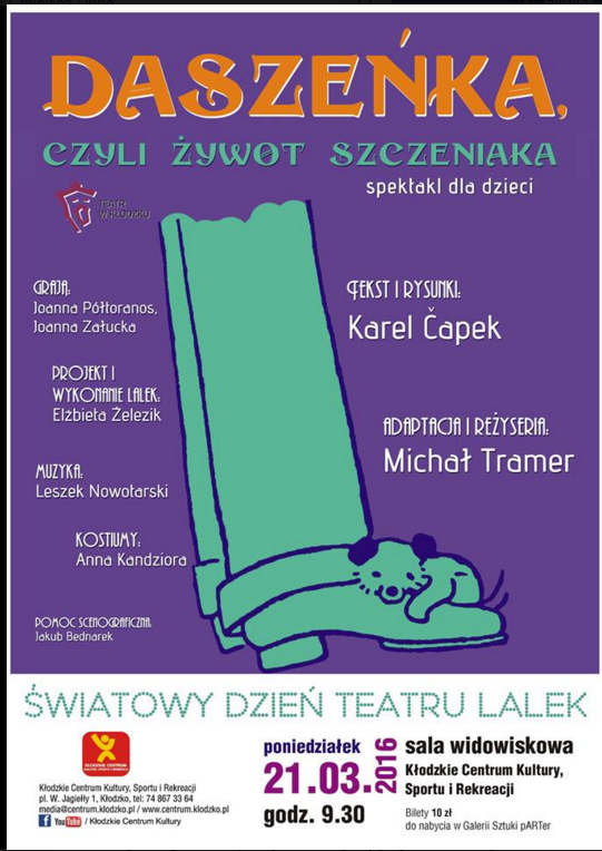 Karel Čapek to jeden z najważniejszych czeskich pisarzy XX wieku. Żył w latach 1890 -1938. W Polsce największą popularnością cieszyła się powieść dla dzieci Daszeńka, czyli żywot szczeniaka, opowiadająca o przygodach psa foksteriera. W tłumaczeniu Jadwigi Bułakowskiej ukazała się w Polsce w 1989 roku wydana przez Naszą Księgarnię. Spektakl ten do prozy Čapka podchodzi z należytym szacunkiem, by w pełni zachować jej ciepły humor i mądrość. Przeróbki tekstu czy skróty zastosowano na tyle, na ile było to konieczne, by przedstawienie dla dzieci miało należyte tempo i dramaturgię. Poza wspaniałym tekstem literackim, dużym walorem spektaklu jest jego strona plastyczna i muzyczna. Kolorowe proste dekoracje i kostiumy stanowią świetne tło dla efektownych lalek psów kunsztownie wykonanych przez Elżbietę Żelezik. Jazzująca muzyka Leszka Nowotarskiego oraz dynamiczna gra obydwu aktorek nadają spektaklowi szczególnej ekspresji. „Daszeńka,…” jest spektaklem jednocześnie radosnym, dynamicznym, ciepłym i mądrym, który nie tylko bawi, ale i uczy. Skierowany jest do wszystkich widzów od 5 do 105 lat, ze szczególnym uwzględnieniem miłośników psów.