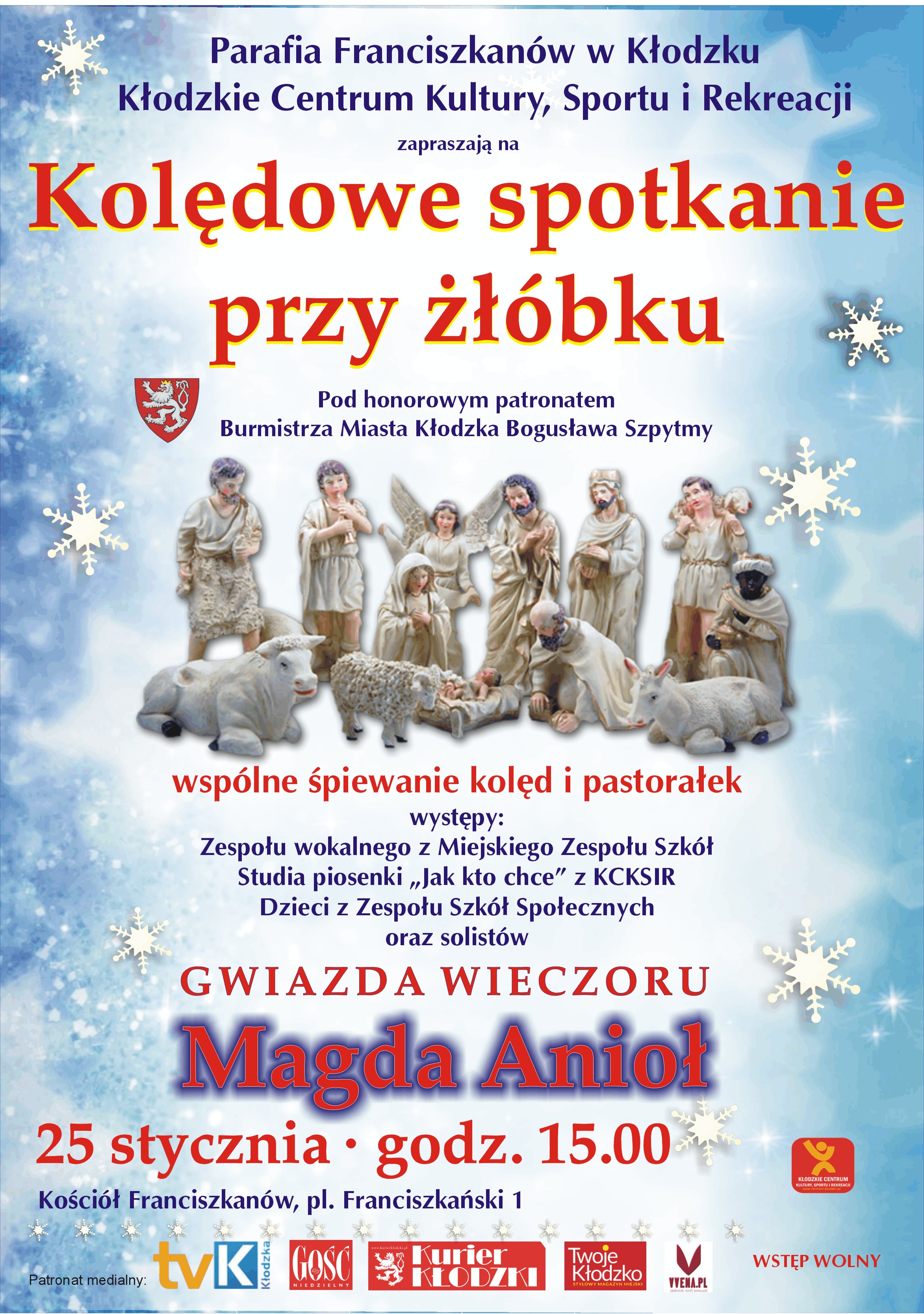 25 stycznia, godz. 15.00 (kościół oo. Franciszkanów) – „Kolędowe spotkanie przy żłóbku”, wystąpią: Zespół wokalny z Miejskiego Zespołu Szkół, Studio piosenki „Jak kto chce” KCKSiR, uczniowie Zespołu Szkół Społecznych w Kłodzku, na zakończenie zaśpiewa piosenkarka polskiej sceny chrześcijańskiej MAGDA ANIOŁ.