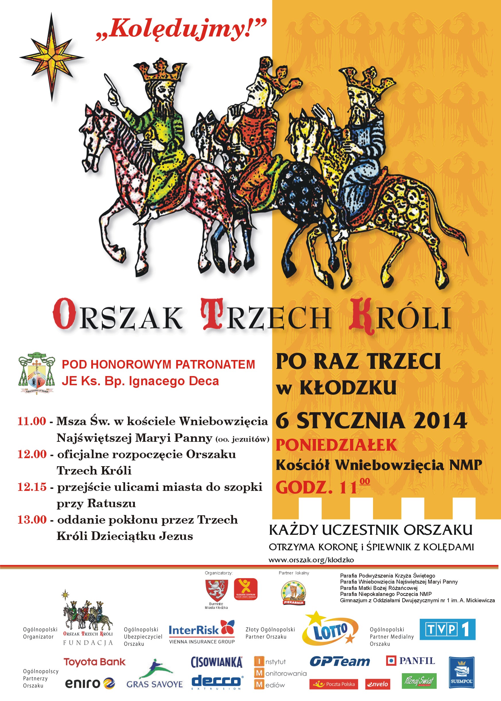 6 stycznia 2014 roku ulicami Kłodzka przejdzie już po raz trzeci Orszak Trzech Króli. Hasłem tegorocznego orszaku jest proste zawołanie: „Kolędujmy!” Oficjalnie orszak rozpocznie się o godz. 12.00 – mieszkańcy Kłodzka i okolic z kolędą na ustach wyruszą spod kościoła Wniebowzięcia NMP w Kłodzku (oo. jezuici). Natomiast godzinę wcześniej – o 11.00 w kościele oo. jezuitów zostanie odprawiona Świąteczna Msza Św. Pod przewodnictwem JE ks bp. Adama Bałąbucha. Orszak zakończy się przy szopce w rynku, gdzie królowie złożą pokłon o swoje podarunki Dzieciątku Jezus.