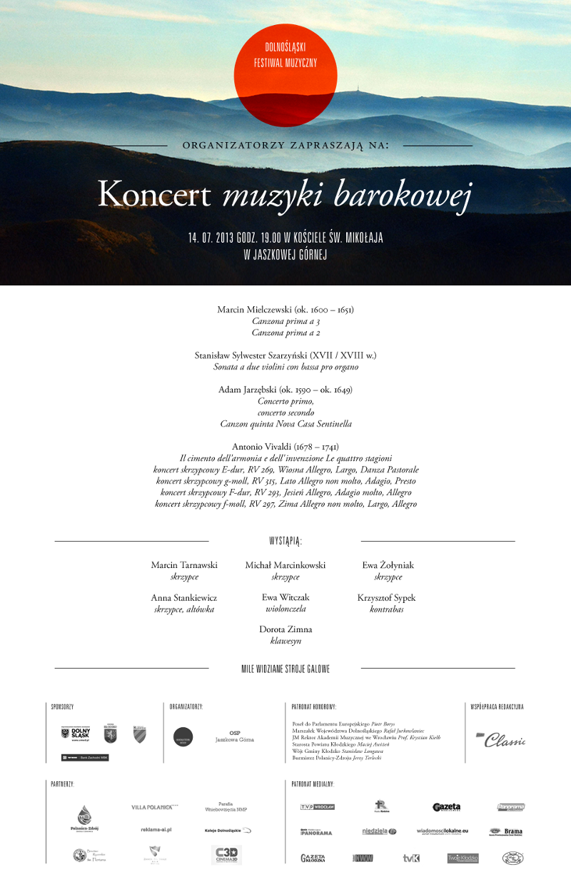 Koncert odbędzie się w ramach projektu Dolnośląski Festiwal Muzyczny, wspieranego przez Urząd Marszałkowski Województwa Dolnośląskiego, Gminę Wiejską Kłodzko i kłodzkie Starostwo Powiatowe. Oczywiście jak zwykle przy świetnej współpracy z Ochotniczą Strażą Pożarną i wydatnej pomocy parafian i mieszkańców Jaszkowej Górnej, która, przypomnijmy, otrzymała tytuł najpiękniejszej wsi dolnośląskiej w 2010 r.