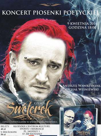 "Sweterek część 1 czyli 13 postulatów w sprawie rzeczywistości" to kolejny solowy skok w bok Michała Wiśniewskiego, jednak zupełnie inny od poprzednich. Tym razem lider Ich Troje dzięki współpracy z Andrzejem Wawrzyniakiem spełnił swoje marzenie i nagrał płytę z piosenką poetycką. „Sweterek …” to suma obserwacji i przemyśleń, czasami dość gorzkich, na temat rzeczywistości. Dzięki tym trzynastu utworom poznamy zupełnie nową twarz Michała Wiśniewskiego. Blisko 1,5 godzinny koncert wypełniony piosenką poetycką którego na długo nie zapomnicie. Po koncercie artyści spotykają się z publicznością i podpisują płyty.