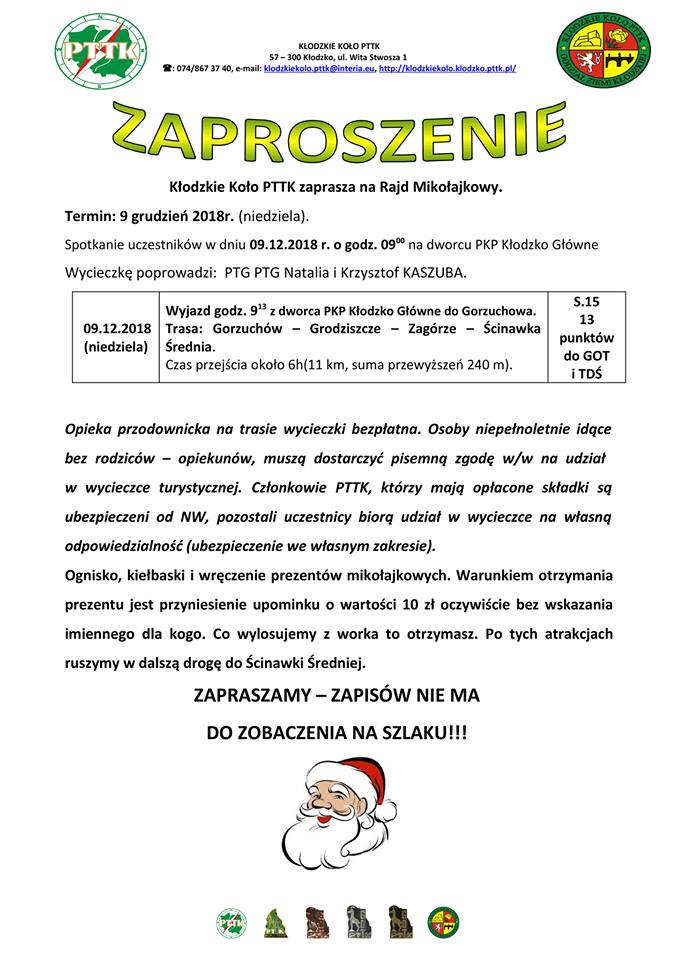 KulturaKłodzkie Koło PTTK zaprasza na Rajd Mikołajkowy. Spotykamy się 9 grudnia o godz. 9:00.