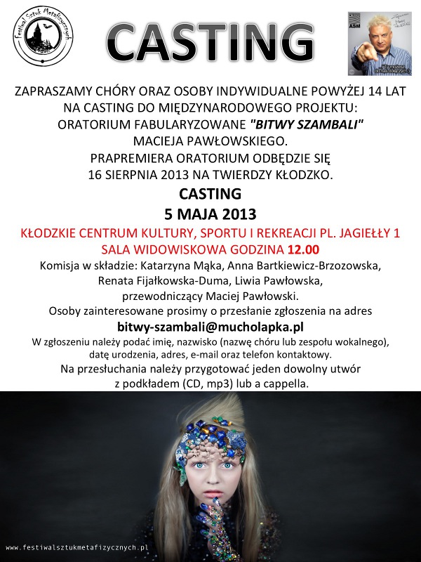 W Kłodzku powstaje oratorium fabularyzowane "Bitwa Szambali" Macieja Pawłowskiego. 5 maja w sali widowiskowej KCKSiR odbędzie się casting do spektaklu. Komisja, której przewodniczyć będzie Maciej Pawłowski będzie wybierała spośród chórów oraz osób powyżej 14 roku życia.