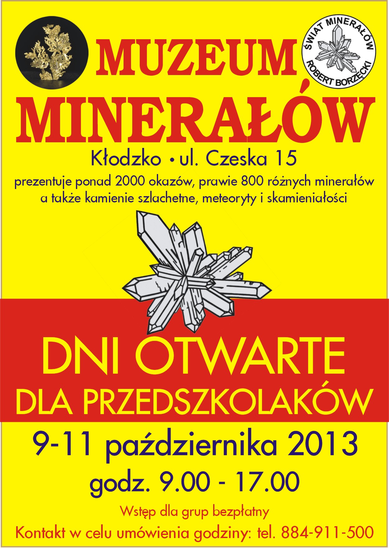 Muzeum Minerałów w Kłodzku / ul. Czeska 15 serdecznie zaprasza na Dni Otwarte dla Przedszkolaków w dniach 9-11 października w godz. 9.00 - 17.00. Wstęp dla grup zorganizowanych bezpłatny. Muzeum prezentuje ponad 2000 okazów, prawie 800 różnych minerałów, a także kamienie szlachetne, meteoryty i skamieniałości.