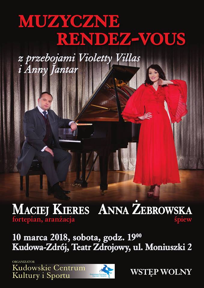 Sobotnie popołudnie (10 marca) w Kudowskim Centrum Kultury i Sportu minie pod znakiem piosenek o miłości. Zapraszamy na klimatyczny recital z piosenkami dwóch niezapomnianych piosenkarek: Violetty Villas i Anny Jantar. Anna Żebrowska z akompaniującym jej pianistą – Maciejem Kieresem, który pracował z Violettą Villas przez ostatnie kilkanaście lat jej kariery, zaproszą Państwa do świata, w którym piosenki mają duszę. Każdy koncert wykonywany jest w pełni na żywo i poza muzyką, zawiera krótkie anegdoty i historie dotyczące Violetty Villas i Anny Jantar.