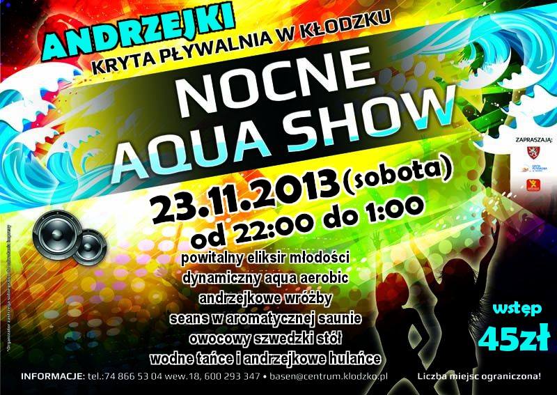 23 listopada (sobota) od 22.00 do 1.00 godz. na krytej pływalni w Kłodzku odbędzie się Nocne Aqua Show. Ilość miejsc ograniczona. Wstęp 45 zł.