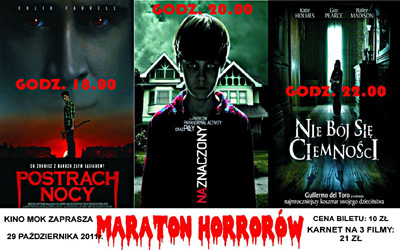 W sobotę, 29 października w Nowej Rudzie rozpocznie się Maraton Horrorów. Początek o godz. 18.00. Cena karnetu na trzy filmy 21 zł, a na pojedynczy 10 zł.
