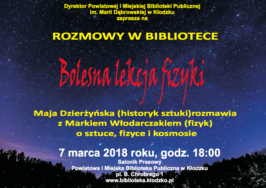 Już 7 marca 2018 roku, o godz. 18.00 zapraszamy na pierwsze spotkanie z cyklu „Rozmowy w bibliotece” pt.: „Bolesna lekcja fizyki”, na którym Maja Dzierżyńska (historyk sztuki, poetka, fotografik ) i Marek Włodarczak (fizyk) będą rozmawiali o sztuce, literaturze, fizyce i kosmosie.