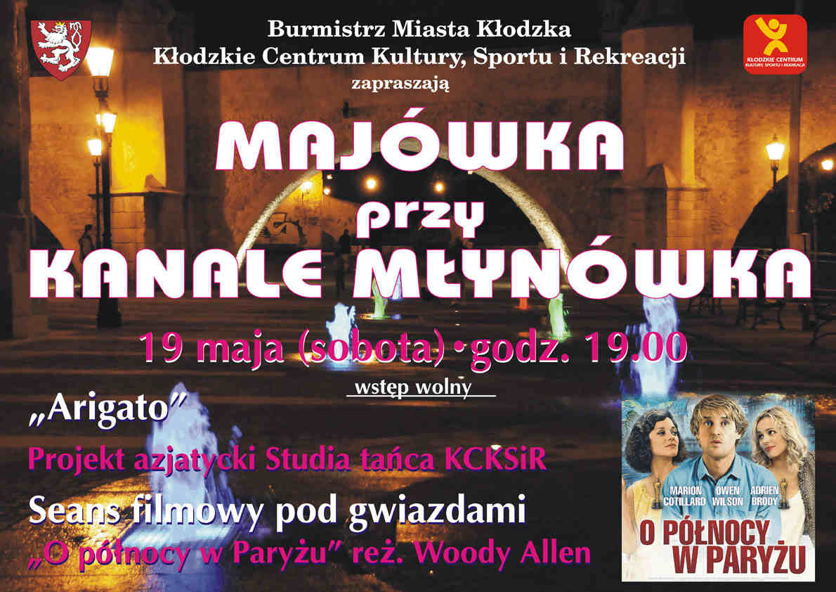 Na placu obok mostu św. Jana (Gotyckiego) a jednocześnie przy kanale Młynówka wystąpi studio tańca KCKSiR z projektem azjatyckim "Arigato" oraz odbędzie się projekcja filmu "O północy w Paryżu" (reż. Woody Allen). Początek w sobotę, 18 maja o godz. 19.00. Wstęp wolny.
