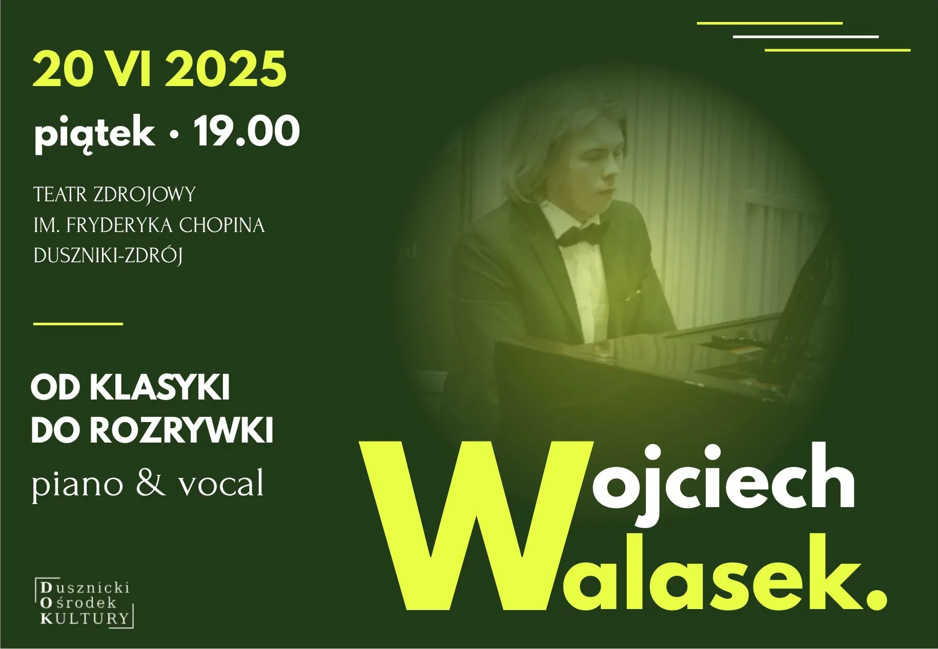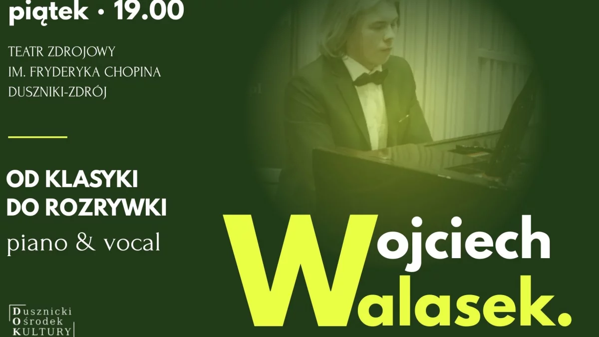 Młody, zdolny, ale już bardzo świadomy pianista. Wojciech Walasek nie wziął się znikąd – to artysta, który krok po kroku buduje swój styl, z wyczuciem i szacunkiem dla tego, co było, ale bez kompleksów wobec tego, co dziś. Kiedy trzeba, sięga po klasykę z pietyzmem. Kiedy może, flirtuje z popem i jazzem. Nie robi z tego cyrku, tylko autorską opowieść o muzyce, którą da się przeżyć na żywo – i zapamiętać. Walasek nie jest publiczności z Dusznik obcy - dwa lata temu na dzień kobiet zachwycił lokalną publikę utworami Chopina, Beethovena, Queen czy Johna Lennona