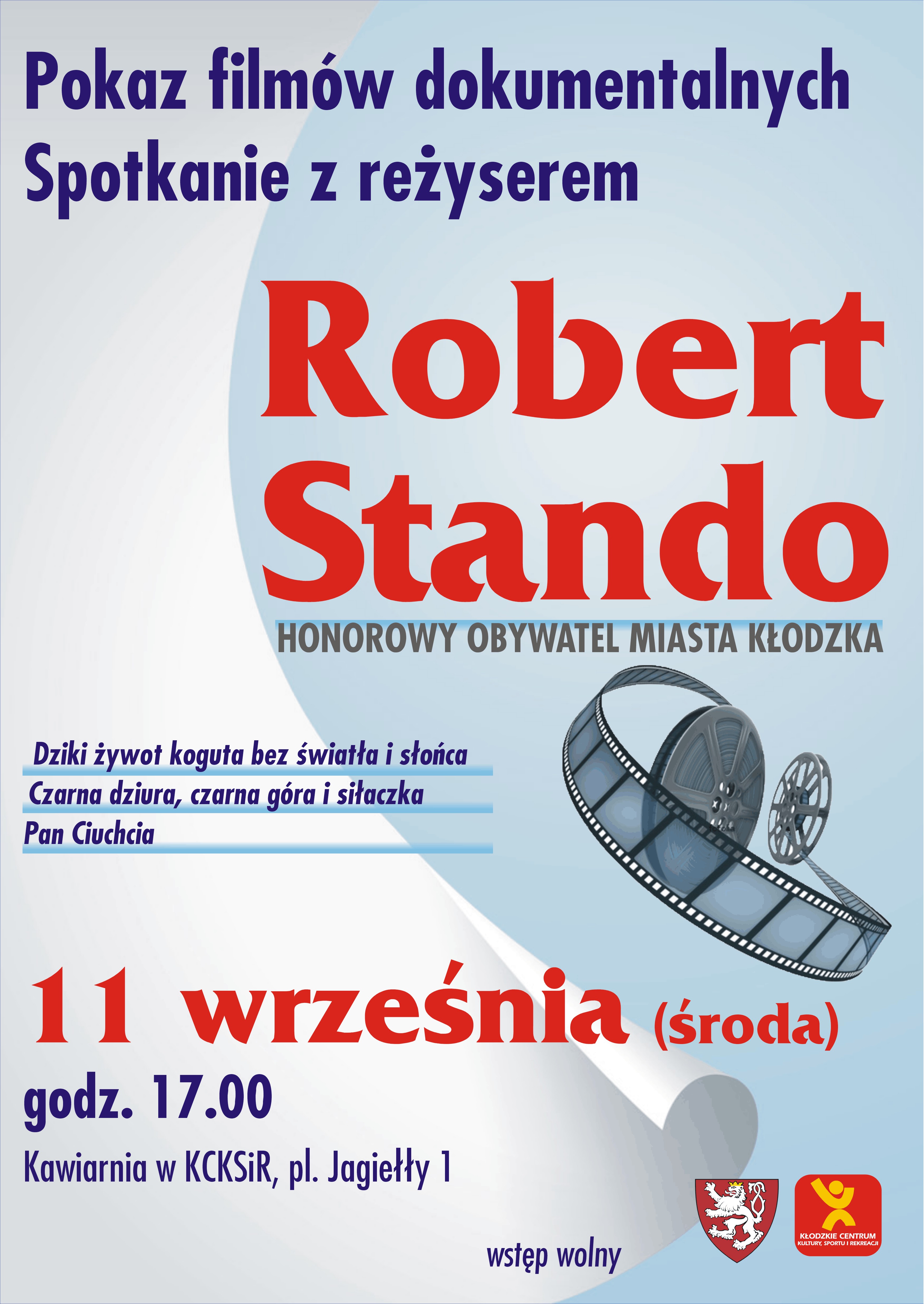11 września 2013 r. w kawiarni KCKSiR /pl. Jagiełły 1/ odbędzie się pokaz filmów dokumentalnych i spotkanie z reżyserem Robertem Stando. "Wydarzenie rozpocznie się o godzinie 17.00, a pokaz obejmować będzie następujące projekcje: 1. Czarna dziura, czarna góra i siłaczka (2003 r.), 2. Dziki żywot koguta bez światła i słońca (1968 r.), 3.Pan Ciuchcia (1968 r.)" - informuje Aleksandra Balicka z KCKSiR-u. Robert Stando urodził się w 1931 roku w Berlinie. Po zakończeniu II wojny światowej osiedlił się wraz z rodzicami w Kłodzku, gdzie uczęszczał do miejscowego I Liceum Ogólnokształcącego im. Bolesława Chrobrego. Po pomyślnie zdanym egzaminie maturalnym rozpoczął studia na Wydziale Reżyserskim Państwowej Wyższej Szkoły Teatralnej w Warszawie, którą ukończył w 1954 roku. Następnie zamieszkał na stałe w Warszawie i związał się z Wytwórnią Filmów Dokumentalnych (do 1972), a potem z Wytwórnią Filmów "Czołówka". Jest autorem kilkudziesięciu dokumentów, w tym o Kłodzku, którego posiada honorowe obywatelstwo.