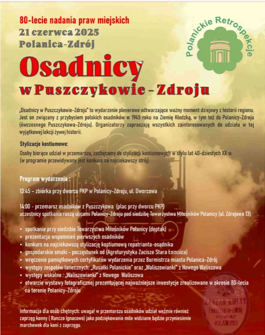„Osadnicy w Puszczykowie-Zdroju" to część większego cyklu wydarzeń pod nazwą „Polanickie Retrospekcje". To niezwykła okazja, by poznać historię miasta, oddać hołd jego pierwszym mieszkańcom i wspólnie celebrować osiem dekad miejskiej tożsamości Polanicy-Zdroju.