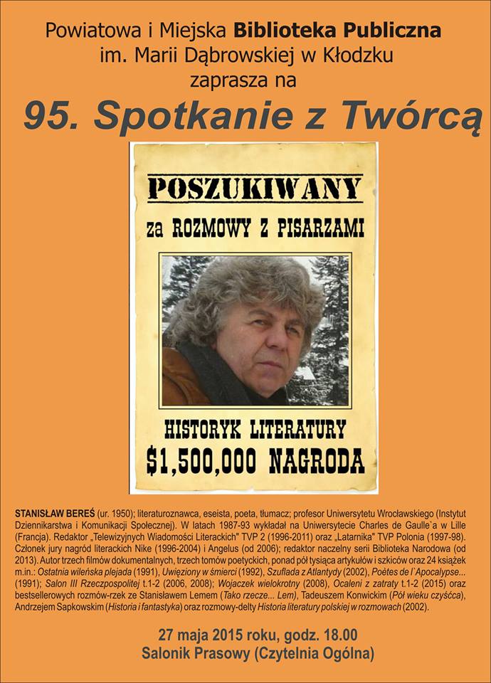 KulturaPowiatowa i Miejska Biblioteka Publiczna im. M. Dąbrowskiej w Kłodzku z przykrością zawiadamia, że spotkanie z prof. Stanisławem Beresiem, zapowiedziane na 27 maja, z przyczyn niezależnych nie odbędzie się