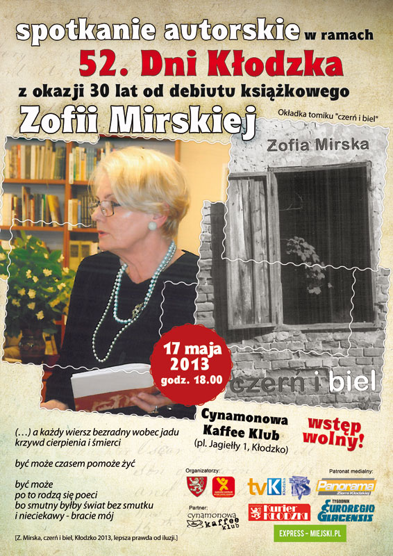 Zofia Mirska jest kłodzką pisarką, która wydała szereg tomików poetyckich. Autorka została także odznaczona tytułem Zasłużonego Działacza Kultury.