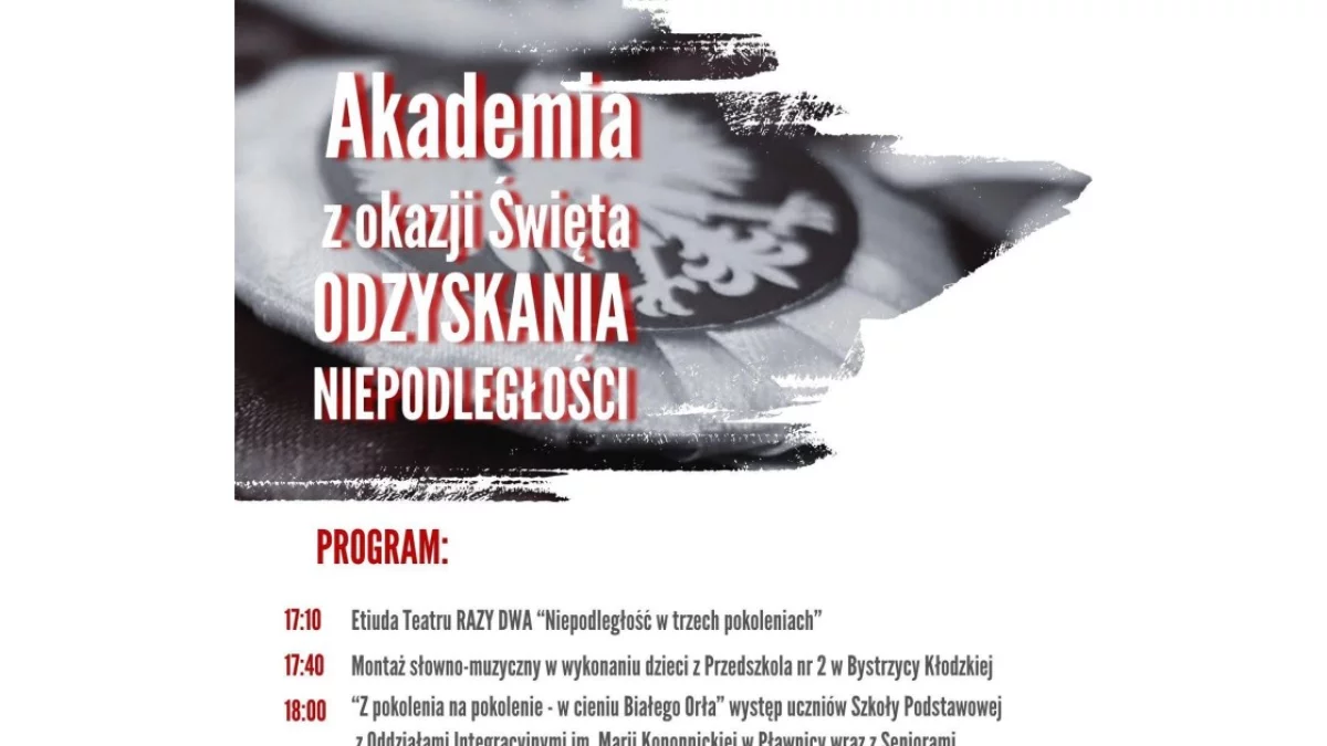 Bystrzyca Kłodzka. W piątkowe późne popołudnie, o godz. 17.00 w Bystrzyckim Ośrodku Kultury i Sportu odbędzie się Akademia z okazji Święta Odzyskania Niepodległości. Program tego wydarzenia obfituje w chwytające za serca występy - zwłaszcza tych najmniejszych artystów. I tak akademia rozpocznie się od Etiudy Teatru RAZ DWA “Niepodległość w trzech pokoleniach”, by następnie widownia zagłębiła się w montaż słowno-muzyczny w wykonaniu dzieci z Przedszkola nr 2 w Bystrzycy Kłodzkiej. O godzinie 18.00 na scenę wyjdą uczniowie Szkoły Podstawowej z Oddziałami Integracyjnymi im. Marii Konopnickiej w Pławnicy wraz z Seniorami, a następnie wystąpią uczniowie z Państwowej Szkoły Muzycznej I i II stopnia w Bystrzycy Kłodzkiej. Całość zwieńczą występy Ludowych Zespołów Śpiewaczych i Zespołów Pieśni. Szczegóły na plakacie.