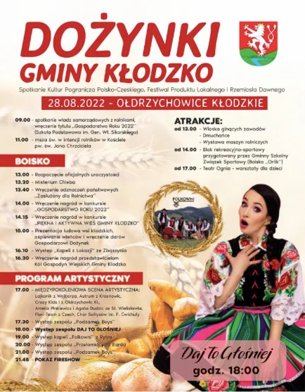 W ostatnią niedzielę sierpnia w Ołdrzychowicach Kłodzkich odbędą się Dożynki Gminy Kłodzko - Spotkanie Kultur Pogranicza Polsko-Czeskiego. Festiwal Produktu Lokalnego i Rzemiosła Dawnego.