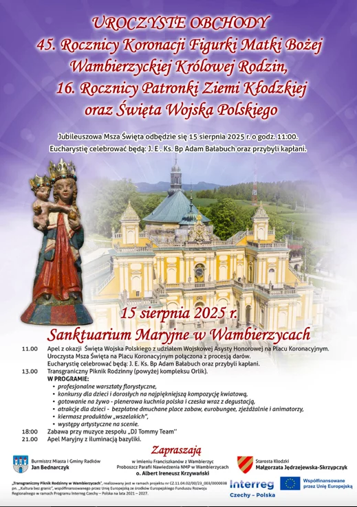 Wydarzenia rozpoczną się punktualnie o godz. 11:00 na Placu Koronacyjnym w Wambierzycach. Uroczysta Msza Święta celebrowana będzie przez Jego Ekscelencję Księdza Biskupa Adama Bałabucha, w asyście licznie przybyłych kapłanów. Liturgia będzie połączona z procesją darów i poprzedzona apelem z okazji Święta Wojska Polskiego, z udziałem Wojskowej Asysty Honorowej.