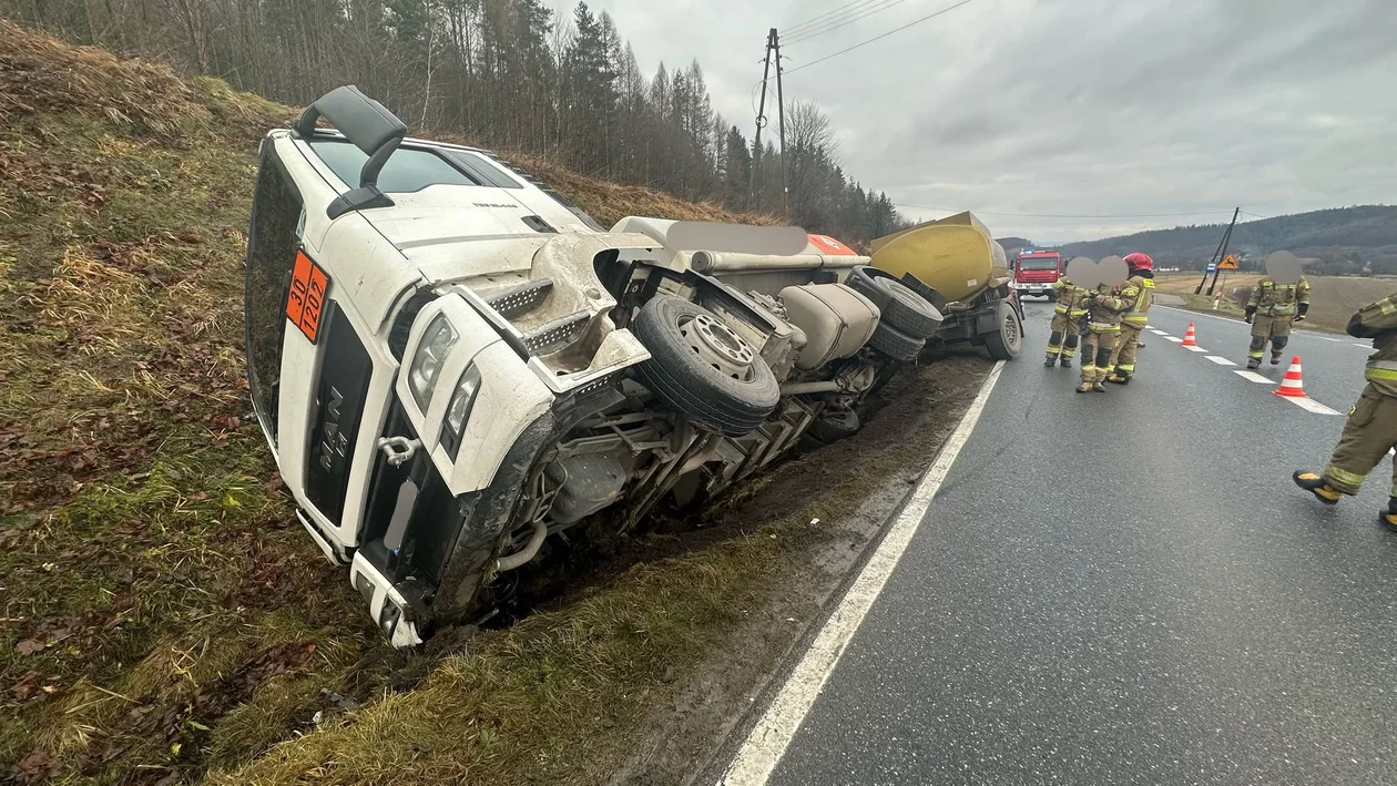 DK 33. Cysterna wpadła do przydrożnego rowu [zdjęcia]