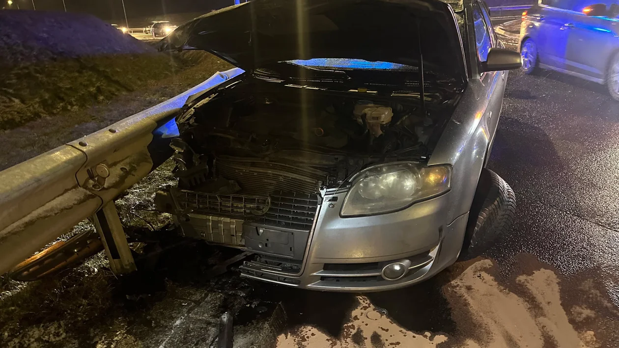Kierujący audi nie dostosował prędkości do warunków panujących na drodze, uderzył w znaki na wysepce, następnie wpadł na rondo gdzie uderzył w kolejne znaki, przejechał przez pół wysepki i uderzył w bariery energochłonne.