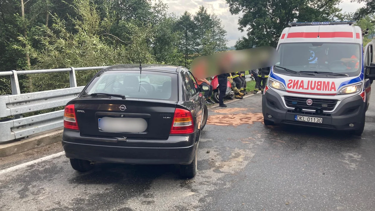 Gmina Szczytna. Czytelnicy poinformowali nas o zdarzeniu do którego doszło między Wolanami, a Chocieszowem. Na drodze wojewódzkiej nr 388 zderzył się opla astry i skuter. Kierujący oplem na łuku drogi wypadł i uderzył w barierki oraz w kierującą skuterem, która została odwieziona do szpitala.