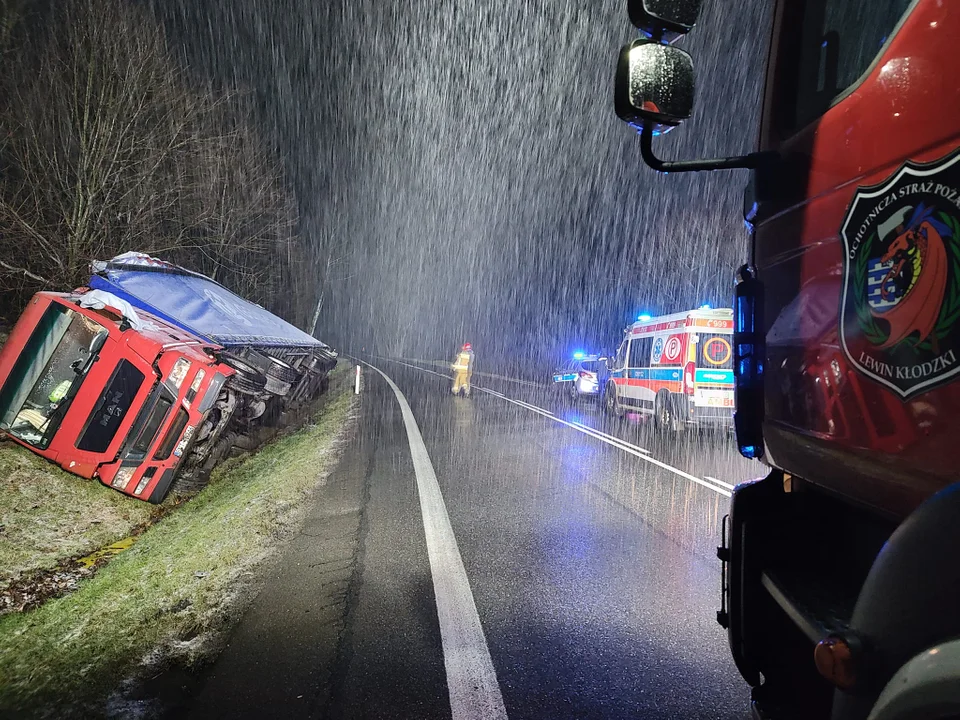 Krajowa ósemka. W sobotę, 25 lutego kilka minut po godz. 4:00 za miejscowością Jeleniów doszło do groźnego zdarzenia. Kierujący samochodem ciężarowym, chcąc uniknąć czołowego zderzenia, zjechał do przydrożnego rowu - informują strażacy z Lewina Kłodzkiego. Mężczyźnie, na szczęście, nic się nie stało.
