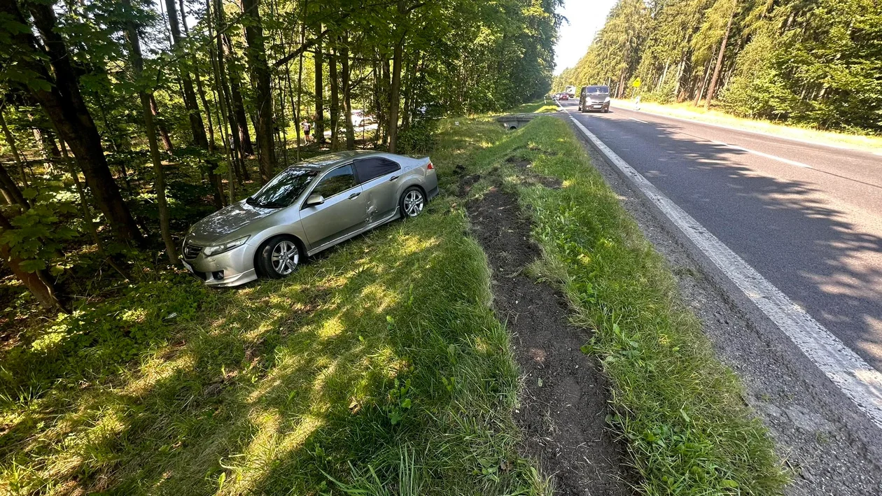 Auto osobowe zahaczyło o bok ciężarówki, kierowca stracił panowanie nad pojazdem i wpadł do rowu. Na szczęście, nikomu nic się nie stało.