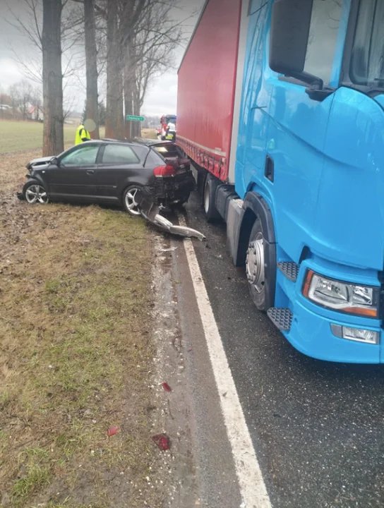 W poniedziałek, 19 lutego około godziny 9.00 na drodze K33 kierowca audi wyjeżdżając z Zabłocia w kierunku Bystrzycy zjechał na lewy pas wprost pod jadącą ciężarówkę.