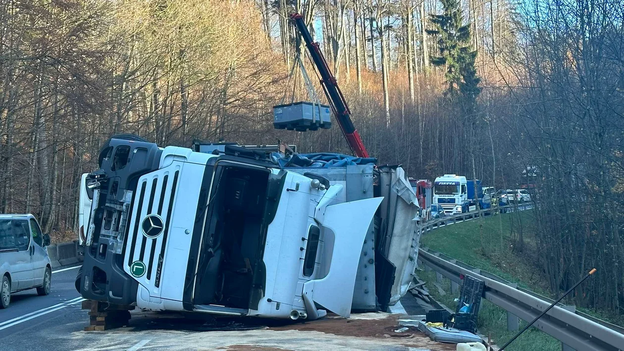 Krajowa ósemka. Dzisiaj, około godz. 6:00, kierowca ciężarówki, obywatel Ukrainy, z nieustalonej jeszcze przyczyny uderzył pojazdem w bariery energochłonne, co doprowadziło do przewrócenia się pojazdu na bok.