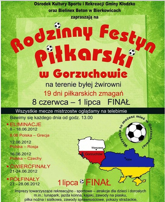 I rzeczywiście, oprócz transmisji wszystkich meczów, będzie można opływać kajakiem, pocwałować konno, pokręcić się na karuzeli i wziąć udział w konkursach sportowych, artystycznych i kulinarnych. Dodatkową atrakcją mają być licytacje działek przy zalewie po żwirowni. Aukcje rozpoczną się od ceny 1 zł. Więcej informacji o piłkarskim festynie można uzyskać w O środku Kultury, Sportu i Rekreacji Gminy Kłodzko w Ołdrzychowicach (tel: 74/868 92 42, kom. 603 306 733, www.okgk.pl).