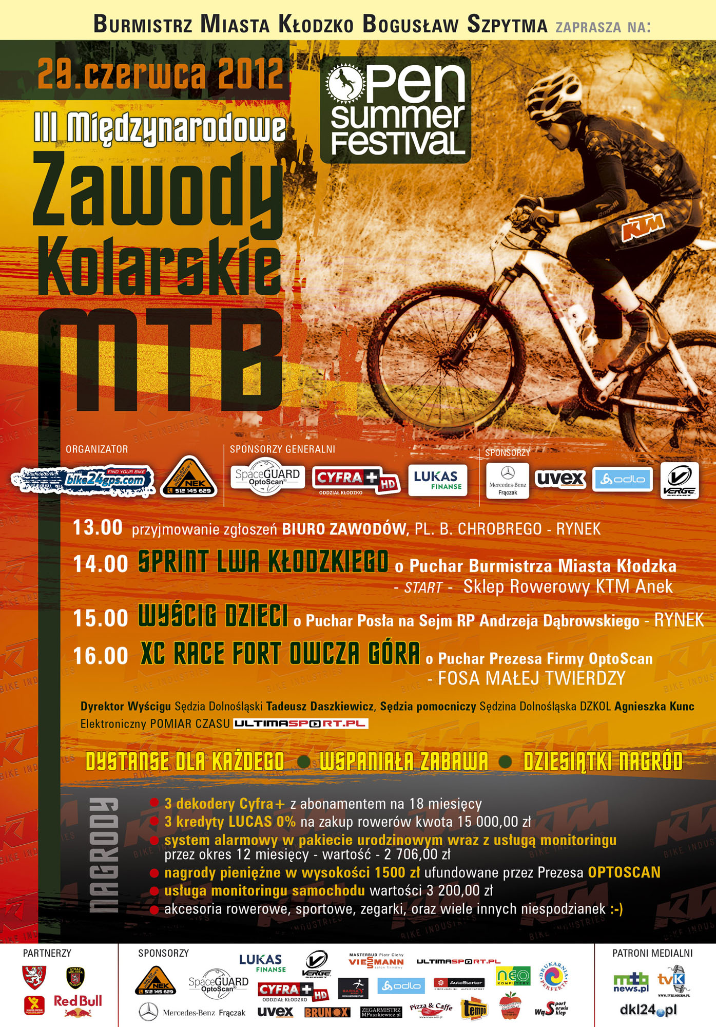 III Międzynarodowe Zawody Kolarskie MTB (kolarstwa górskiego) wystartują na kłodzkim rynku o godz. 14.00. Zaplanowano wtedy "Sprint Lwa Kłodzkiego o Puchar Burmistrza Miasta Kłodzka". Godzinę później dzieci będą rywalizować na swoich rowerach o puchar posła Andrzeja Dąbrowskiego.