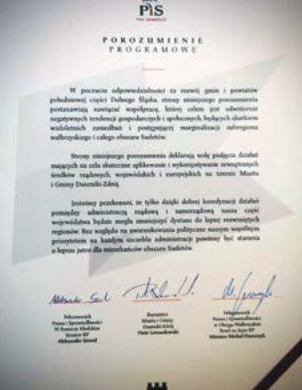 WiadomościW piątek, 16 października, burmistrz Dusznik-Zdroju, Piotr Lewandowski poinformował na swoim oficjalnym profilu o podpisaniu porozumienia programowego z posłem Michałem Dworczykiem, jako pełnomocnikiem PiS w okręgu wałbrzyskim i senatorem Aleksandrem Szwedem, jako pełnomocnikiem PiS w powiecie kłodzkim. W sieci zawrzało.