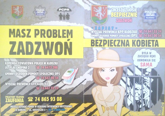 Komenda Powiatowa Policji w Kłodzku oraz Urząd Miasta w Kłodzku zapraszają do udziału w XI edycji kursu "BEZPIECZNA KOBIETA". Celem programu „Bezpieczna Kobieta” jest przybliżenie uczestniczkom podstawowych zasad zachowania w sytuacji zagrażającej życiu lub zdrowiu. Szkolenie jest bezpłatne i trwać będzie około 2 miesiące. Zorganizowane będzie dla mieszkanek Kłodzka. W ramach szkolenia odbędą się spotkania z psychologiem, a także zajęcia praktyczne z samoobrony. Osoby zainteresowane udziałem w przedsięwzięciu prosimy o kontakt z Wydziałem Prewencji KPP w Kłodzko nr tel. 74 647 33 01, 74 647 33 24. Spotkanie organizacyjne odbędzie się 23 września 2013 r. o godz. 17.00 w Boguszynie w Hotelu „Metro”.