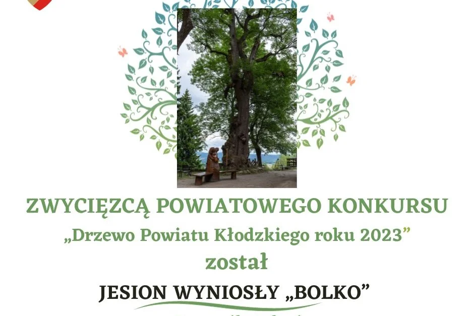 Powiat Kłodzki. W wyniku przeliczenia głosów w ankiecie internetowej w ramach konkursu drzewem powiatu kłodzkiego roku 2023 po uzyskując 116 wybrany został Jesion Wyniosły „Bolko” z Dusznik – Zdroju.