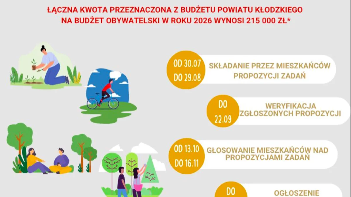 Już niebawem rusza kolejna edycja Budżetu Obywatelskiego Powiatu Kłodzkiego na rok 2026. Od 30 lipca do 29 sierpnia mieszkańcy mają szansę zgłaszać projekty, które mogą otrzymać wsparcie finansowe od 5 tys. zł do 15 tys. zł.