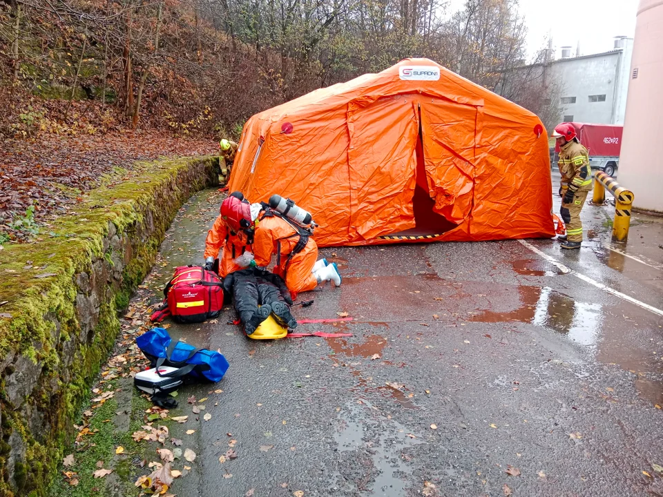 Bystrzyca Kłodzka. Wczoraj na terenie zakładu Mondi BZWP, produkującego opakowania i tekturę falistą, odbyły się ćwiczenia w ramach doskonalenia zawodowego. Ich scenariusz zakładał uwolnienie ciekłego wodorotlenku sodu, będącego jednym z substratów kleju wykorzystywanego w procesie technologicznym zakładu. W wyniku wycieku medium poszkodowane zostały dwie osoby.