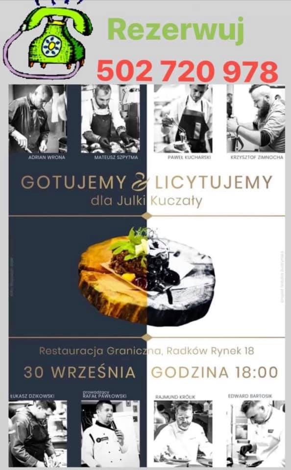 W najbliższą środę, 30 września o godz. 18.00 w Radkowie na Rynku w Restauracji Graniczna odbędzie się charytatywna kolacja. Bilet wstępu na kolację wynosi 150 zł od osoby. Całość kwoty zasili konto Julki Kuczały. Dla gości ugotuje 7 świetnych kucharzy, którzy na co dzień pracują na Dolnym Śląsku w znakomitych restauracjach. Podczas kolacji odbędzie się kilka licytacji, będzie także przygotowany stół z cichymi licytacjami.