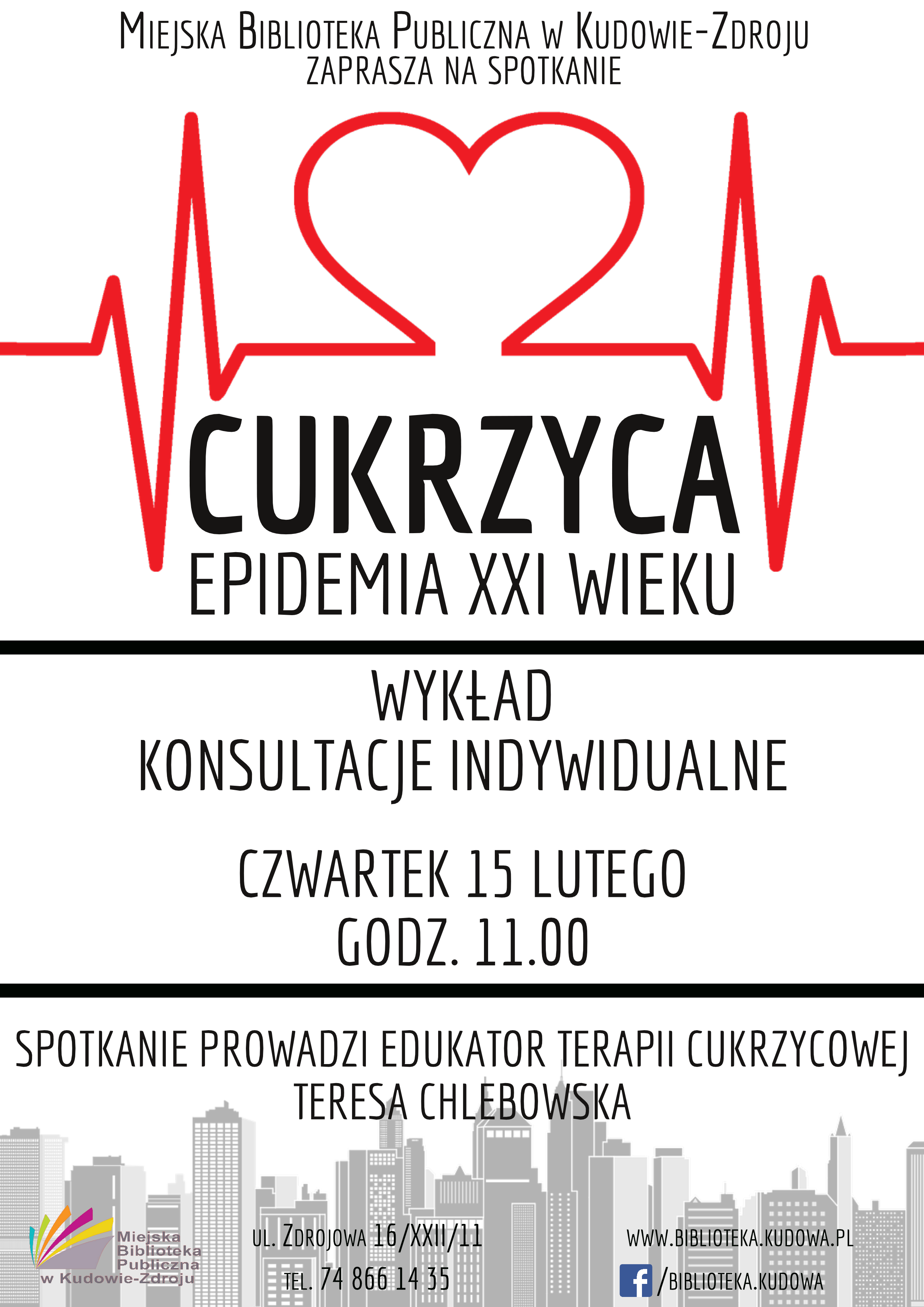 Zapraszamy w czwartek 17 utego o godzinie 11:00 do Miejskiej Biblioteki Publicznej w Kudowie- Zdroju na spotkanie poświęcone cukrzycy - objawy choroby, objawy, porady dla cukrzyków i wiele innych. Po wykładzie zapraszamy na konsultacje indywidualne. Teresa Chlebowska jest edukatorem terapii cukrzycy a swój wykład poprowadzi w oparciu o publikacje prof. Jana Tatonia i innych ekspertów Światowej Organizacji Zdrowia. Wstęp wolny