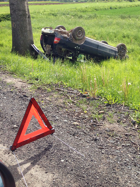 Samochód po dachowaniu jest w bardzo złym stanie technicznym. Na szczęście pasażerowie nie odnieśli poważnych obrażeń.