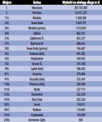 Ile samorządy wydają na obsługę długów? W 2014 r. gmina Wałcz przeznaczyła na ten cel tylko 14 zł, a Warszawa ponad 287 mln zł. A ile na odsetki i prowizje bankowe wydają samorządowcy z twojej gminy? Łącznie wszystkie 2.479 gminy w 2014 roku wydały na obsługę długów ponad 2 mld zł. Obsługa kosztów zadłużenia obejmuje przede wszystkim: oprocentowanie kredytów i pożyczek, prowizje bankowe oraz koszty emisji obligacji. Z danych Głównego Urzędu Statycznego wynika, że w 2014 r. 47 gmin (1,9 proc.) nie poniosło żadnych kosztów w związku z obsługą długu. W tej grupie nie było jednak żadnej z 21 gmin należących do powiatów kłodzkiego i ząbkowickiego. Najmniej dała zarobić bankom gmina Kamienic Ząbkowicki, która na oprocentowanie i prowizje bankowe wydała w 2014 roku tylko 603 zł. Najwięcej banki zarobiły na długach Kłodzka, które na oprocentowanie i prowizje wydały ponad 1,5 mln zł. W sumie 21 gmin należących do powiatów kłodzkiego i ząbkowickiego dały zarobić bankom ponad 10,5 mln zł.